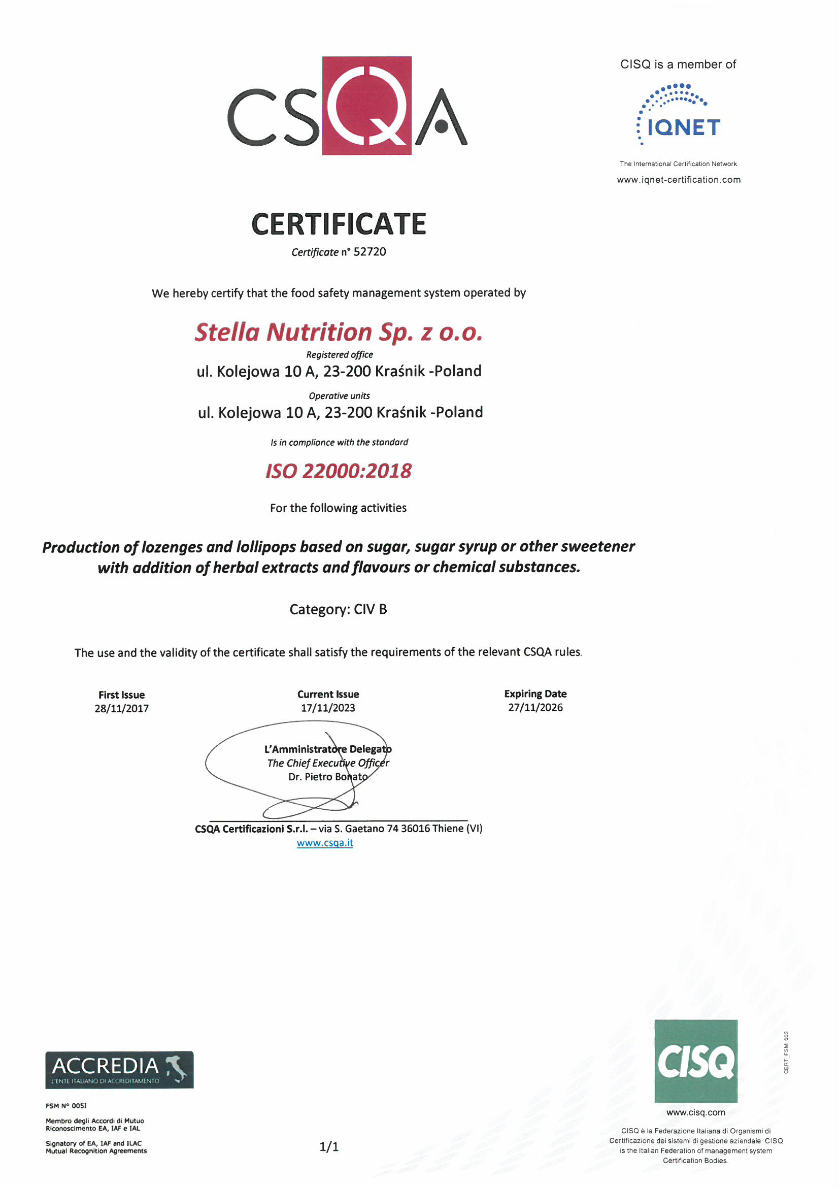 Stosujemy rygorystyczne systemy zapewnienia jakości, potwierdzone certyfikatami ISO 22000 oraz GMP.